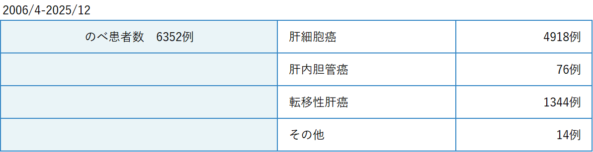 ※術関連死例について、1例目は、ラジオ波焼灼療法翌日に心停止で発見され、たこつぼ心筋症が疑われた症例で、低酸素脳症を来して、術後44日目に在院死となった。2例目は、肝拡大左葉切除後の肝細胞癌再発に対して、ラジオ波焼灼療法を施行し、術後107日目に在院死となった例で、原因としては穿刺および焼灼に伴う肝静脈胆管瘻が考えられた。3例目は、ラジオ波焼灼療法前に、腫瘍による肝内胆管の圧排を解除するために施行したERCP(内視鏡的逆行性胆管膵管造影)にて急性膵炎を来し、その後感染から敗血症性ショック、さらに急性呼吸窮迫症候群へ進展し、ERCP後84日目に在院死となった。