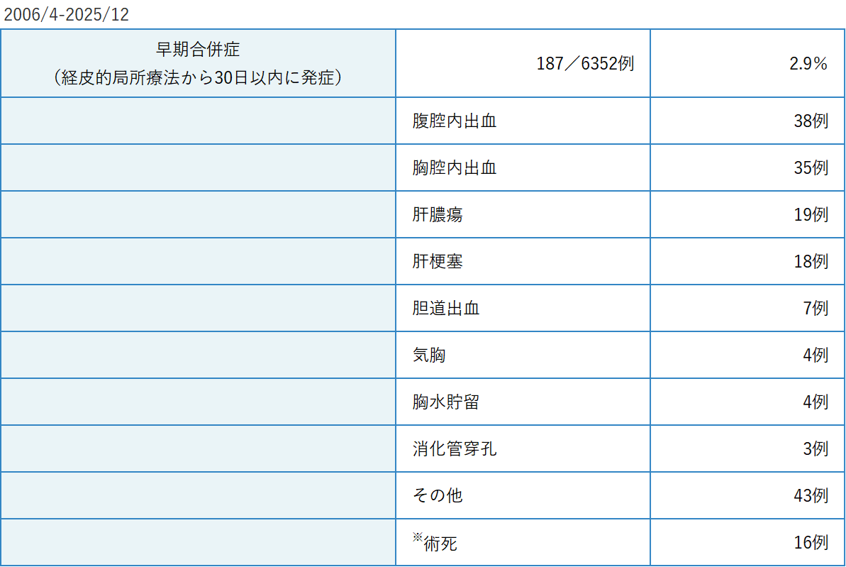 ※経皮的局所療法後30日以内の死亡=術死例について、合併症からの進展例として3例(焼灼域の膿瘍化から腹腔内に穿破し、腹膜炎になったと考えられた1例、肝梗塞から肝不全・高カルシウム血症となった1例、十二指腸穿孔から腹膜炎・DIC・肝不全に至った1例)、手技が間接的に影響したと考えられる症例として1例(術中死・急性大動脈解離 剖検あり)、手技と直接的な因果関係が不明な症例として7例(間質性肺炎増悪1例、たこつぼ型心筋症1例、人工透析後の突然死1例、膵癌肝転移巣治療後に原発巣が心膜・肺へ浸潤して呼吸不全にて死亡した1例、後頭葉転移破裂によって死亡した1例、腫瘍随伴症候群に伴う高カルシウム血症の1例、腹部リンパ節転移が関与したと思われる十二指腸潰瘍出血の1例)、治療効果が不十分であったことが影響した症例として4例(肝外側区から胃壁浸潤した肝細胞癌に対してエタノール注入療法を施行するも消化管出血が止血できなかった1例、肝破裂の1例、横隔膜浸潤した肝細胞癌からの血胸を止血しようとした1例、肝細胞癌の胸膜転移による血胸を止血しようとした1例)、退院2日後の他院での消化管出血死1例(詳細不明)を認めた。