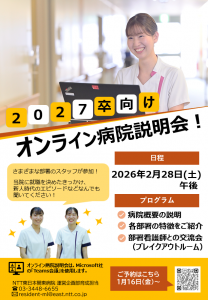 内 容:さまざまな部署の先輩看護師がオンラインで参加します。各部署の紹介や質疑応答の時間も設けておりますので、気になる点を直接ご質問いただけます。