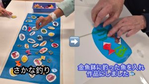 さかな釣りでは釣ったさかなを袋に入れ装飾し、それぞれ作品にしてお持ち帰りしていただきました。