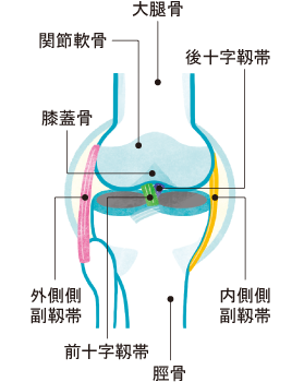 膝は、大腿骨と脛骨、膝蓋骨(お皿)などで構成されており、大腿骨と脛骨を関節軟骨が覆っています。また、外側側副靱帯、内側側副靱帯、後十字靱帯、前十字靱帯4つの靱帯が膝の安定を支えています。4つの靱帯に異常がないことは、人工膝関節単顆置換術を行う条件の1つです。